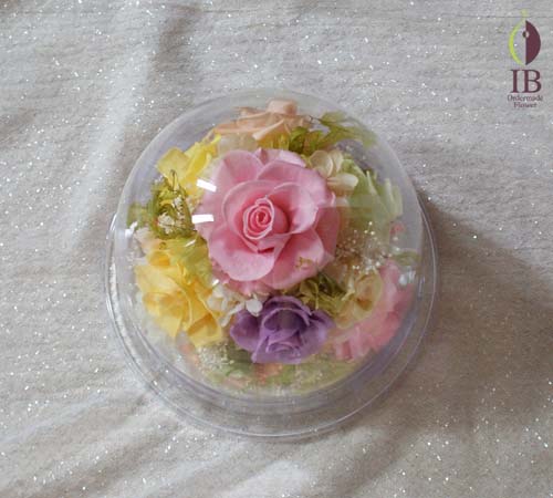 アクリルドームへの装飾ですので場所をとらず、プリザーブドフラワーを長期間お楽しみいただけます。