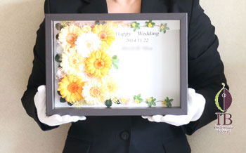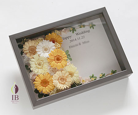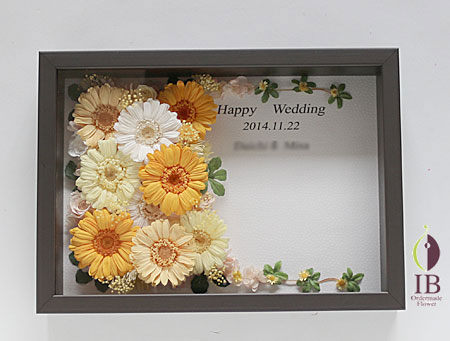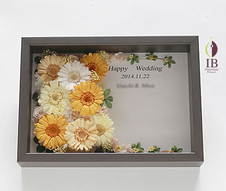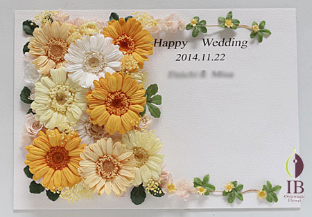 ご友人様への結婚お祝いフォトフレームです。お花は淡いイエローやオレンジ系のグラデーションのガーベラを使用いたしました。
