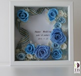 正方形のフレームの真ん中にL版の写真が入るように淡いピンクと白のバラでお願いたします。