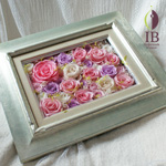 お友達の開業御祝に虹色のバラをハート型のリースにし、その中にメッセージを入れたフレームを製作してほしい