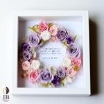 お母様の古希のお祝いにフレームの中にリースの形を製作させていただきました。中央には感謝のメッセージをお入れしています。