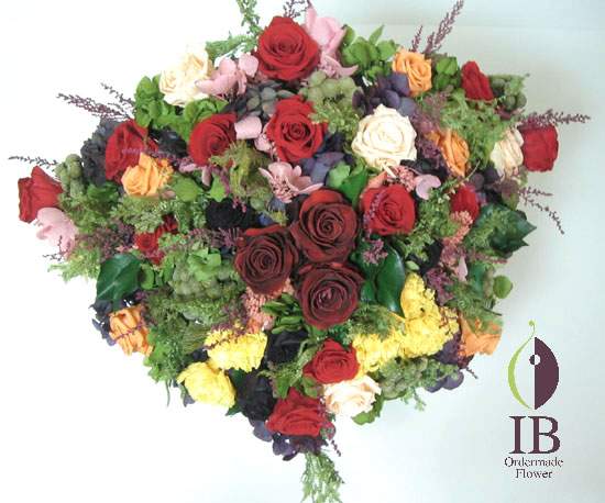 パステルパステルのようなやさしい色のお花の配色で、楽しく、さわやかな感じに仕上げました。
