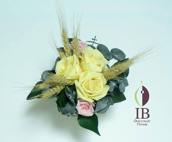 リボン、モス、アート製素材などで、バラの密度を多めに3方正面でお願いしたいです。