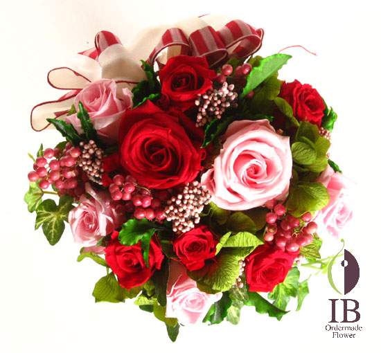 プリザーブドフラワーのバラのレッド系とブルー系のミックスを使用して、