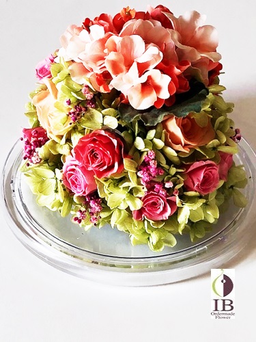 お誕生日のお祝いにご希望の木立ベコニアのをメインにした可愛らしいドームアレンジを製作させていただきました。木立ベコニアはプリザーブドフラワーでは販売されていませんのでアートで製作したあります。