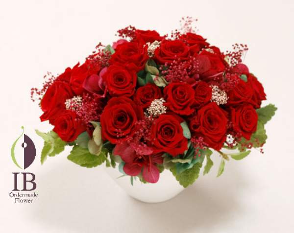 レッド系のバラは、中心にプリザードフラワーバラチェリーレッドを配置し、
