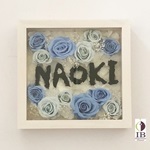 ご要望通り、花器は正方形フレーム白を使用して、ご指定のデザインのキャラクターをお花で装飾させていただきました。