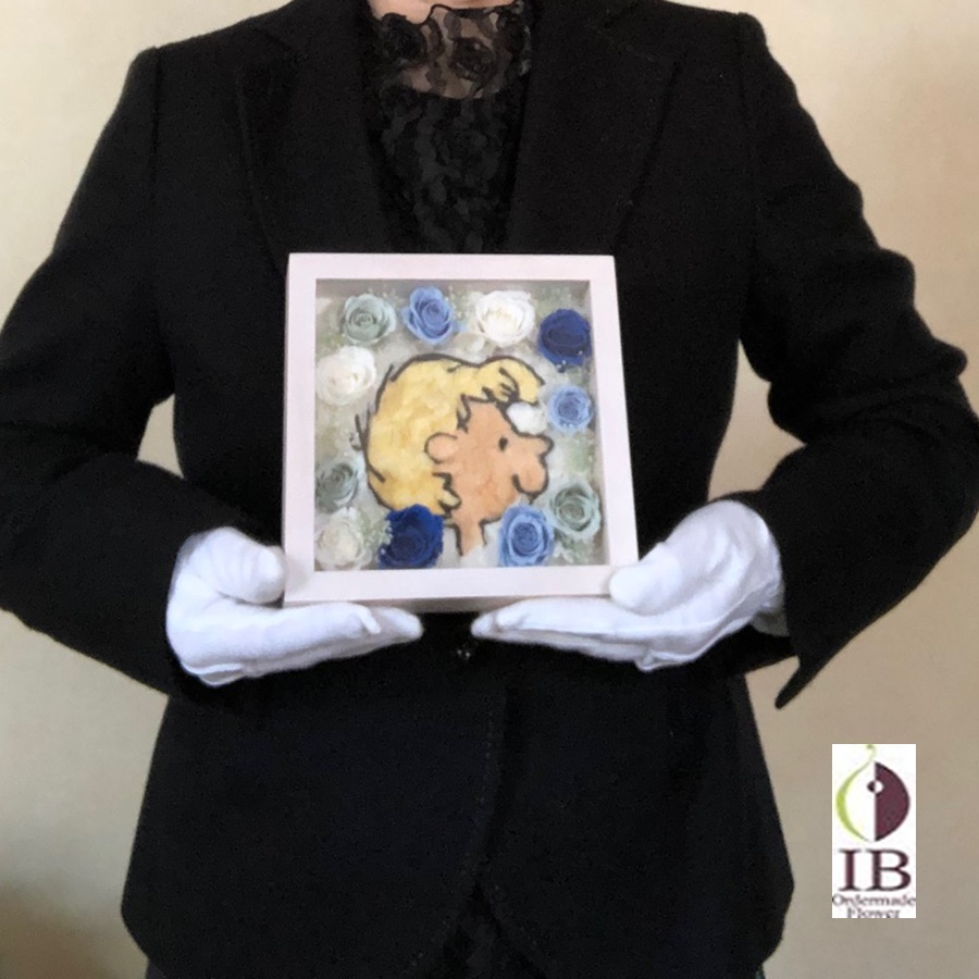 お母さまのお誕生日のお祝いにお気に入り頂きました170309ss のスヌーピーを違うキャラクターでシュローダーに替えて周りのお花はご希望のブルー系のバラでおつくりいたしました。可愛らしく且つ爽やかな感じに仕上がっています。