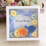 ご要望通り、花器はA4サイズフレーム白を使用して、いただきましたロゴデータを基にイメージカラーの青色濃淡色のバラで装飾させていただきました。