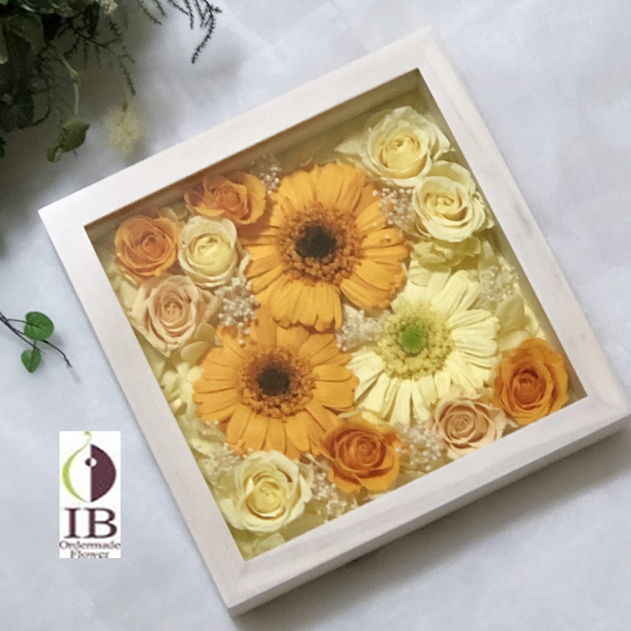 奥様のお誕生日のプレゼントを製作させていただきました。元気が出るビタミンカラーのオレンジ、イエローのガーベラやバラをフレームの中に咲かせました。