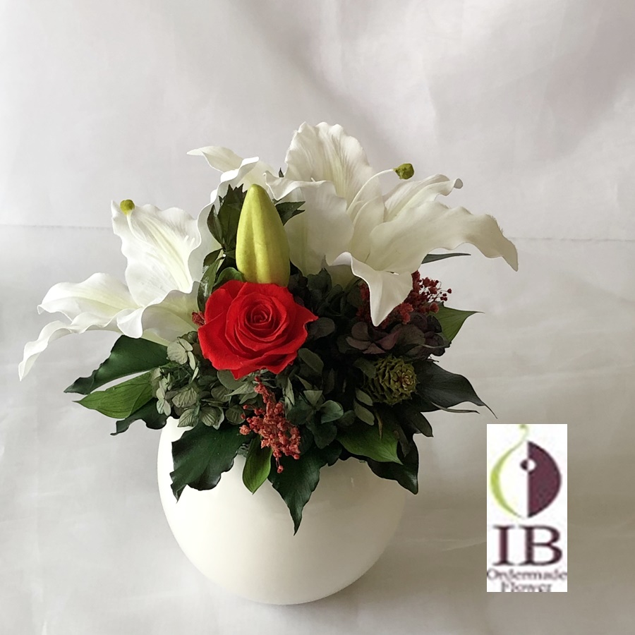 カサブランカはこのような器へのアレンジですと傷みやすいのが難点ですがその点こちらは全く心配ありません。母の日なので赤バラと合わせています。