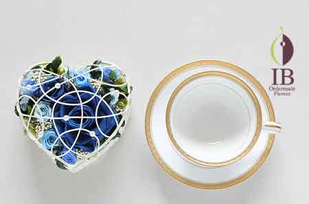 大切な方への告白のお花。青いバラのグラデーションをハート型のカゴに詰めて。