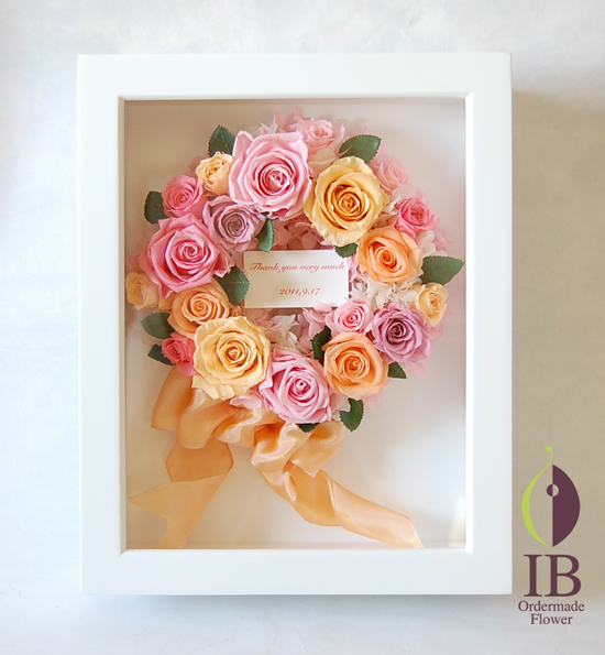 ずっと長く綺麗な状態を楽しんでいただくために、ガラスのカバーつきフレームの中にお花を入れたアレンジです。