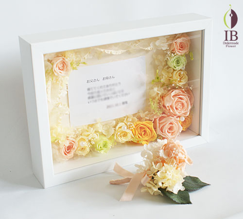 B5フレームにプリザーブドバラをお入れした、ご両親贈呈用のお花を製作いたしました。