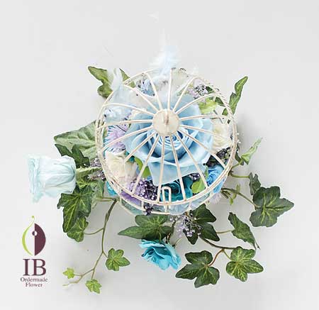 誕生花ブルーサルビアとカラージュームの装飾希望。
