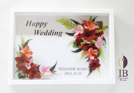 ずっと長く綺麗な状態を楽しんでいただくために、ガラスフレームつきウッドボックスの中にお花をアレンジいたしました。フレームタイプのお花は、お手入れも簡単ですので御贈答に大変喜ばれております。