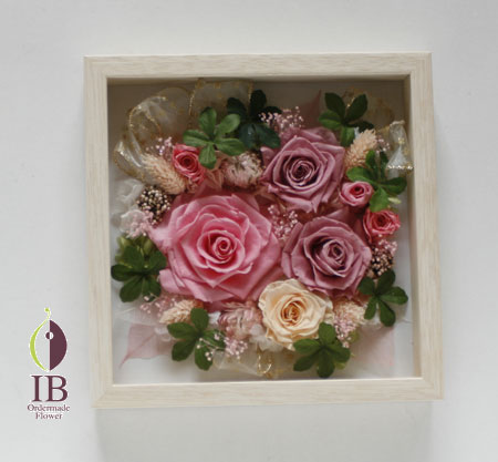 ご要望通り正方形フレームの中に、リースの形で、バラの配色をピンク系濃淡とグリーンを使用して