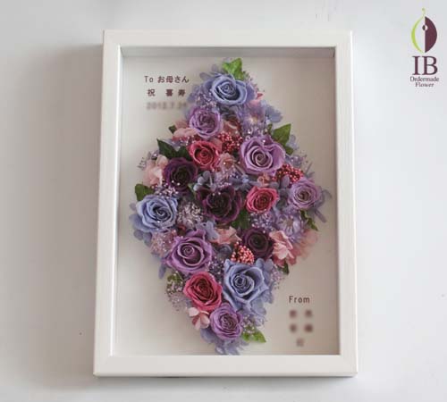 ご指定のご予算で、お気に入りいただきました120419tn古希のような感じのデザインで、紫系バラのグラデーションと白色を少し足して御仏前に飾られます遺影用フレームを製作させていただきました。