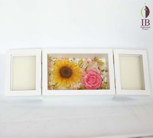 また生花と違い、長期間、みずみずしく咲き続けますので、大変お喜びいただいております。ガラス表面を拭くだけのお手入れなので、御贈答に大変人気のフレーム花アレンジメントです。